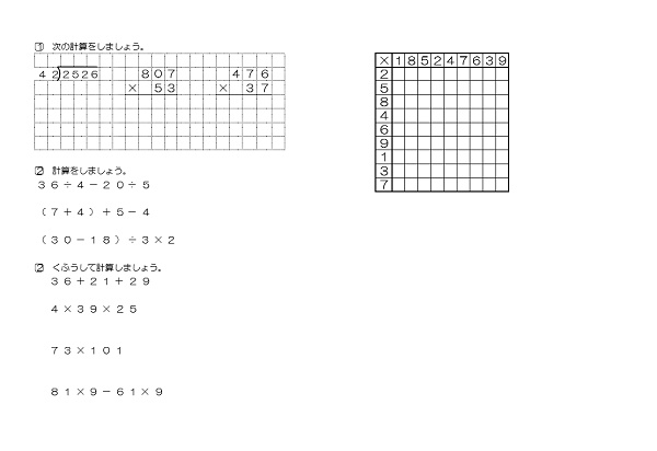 次の次の単元、小数のかけ算、わり算に備えて、整数のかけ算わり算のひっ算です。